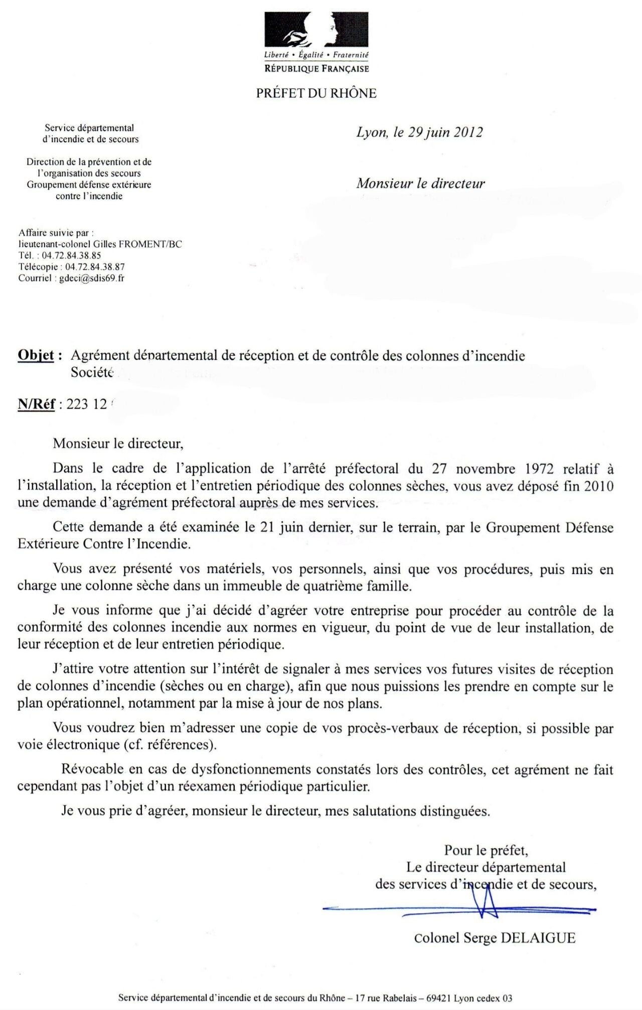 Cet arrêté stipule que seule une entreprise possédant un agrément préfectoral dans le Rhône, peut manipuler, maintenir et réceptionner les colonnes sèches et les colonnes en charges (humides) du département DN 65 et DN 100.